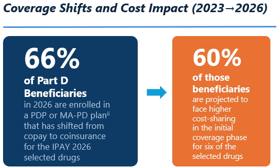 In 2026, about two-thirds (66%) of Part D beneficiaries are enrolled in a standalone prescription drug plan (PDP) or Medicare Advantage Prescription Drug (MA-PD) planii that has shifted coverage of IPAY 2026 selected drugs from a fixed copay to coinsurance between 2023 and 2026. Among these beneficiaries, about 60% are projected to face higher cost-sharing after reaching the deductible and before the maximum out-of-pocket cap (ie, the initial coverage phase) than they would have faced in 2023. For the millions of beneficiaries who take one of six IPAY 2026 selected drugs, out-of-pocket increases could range from 22% to 118%iii. - Specialty-tier drugs can show “savings,” but the impact may be limited