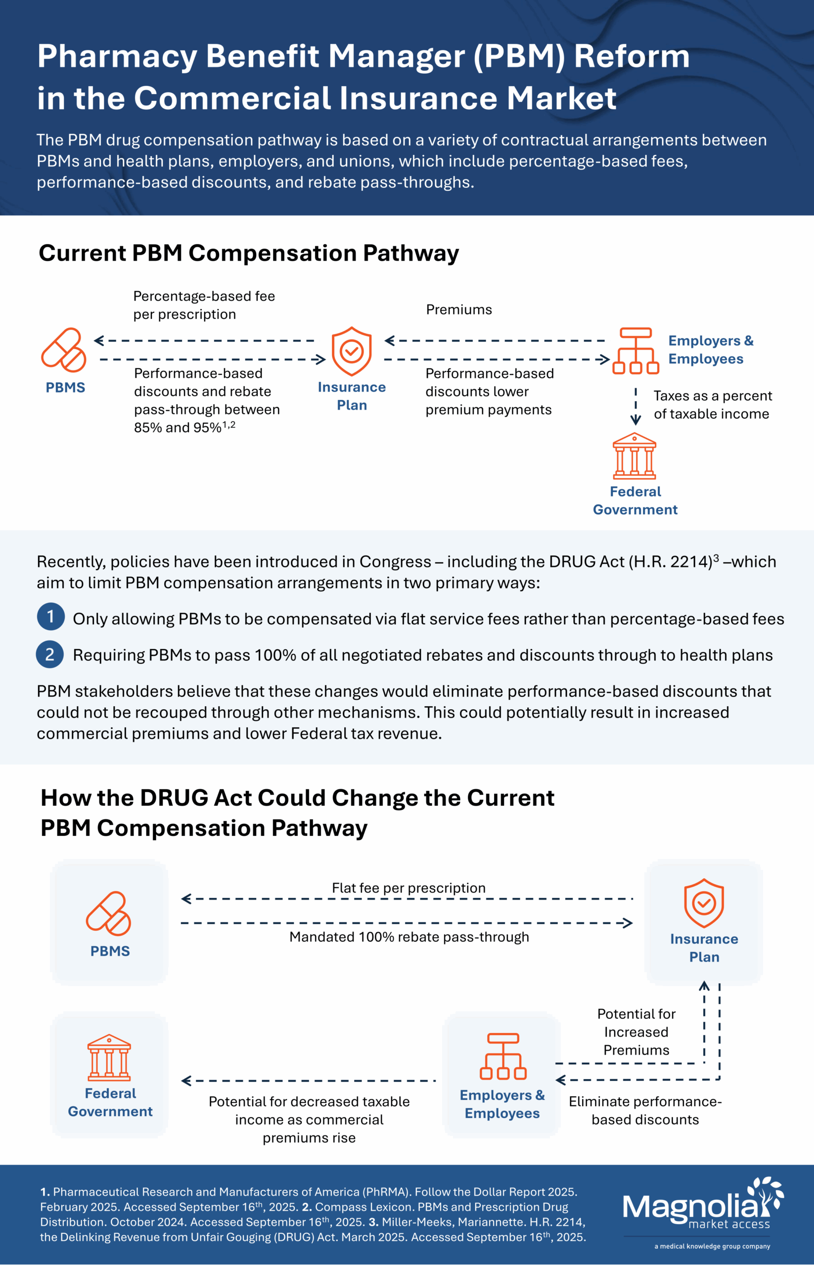 Congress is considering changes that would significantly alter how Pharmacy Benefit Managers (PBMs) are compensated in commercial insurance. The DRUG Act (H.R. 2214) proposes two key shifts: